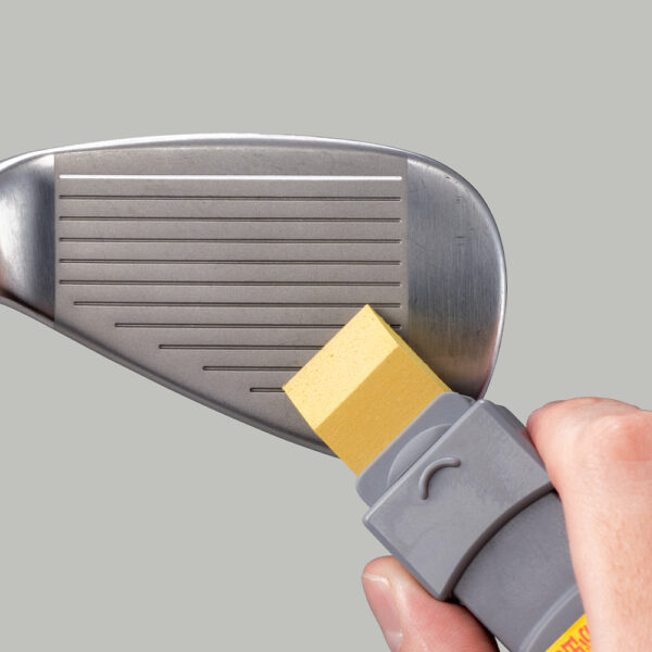 洗剤や薬剤を使用せずにクラブの汚れ、サビ、くすみなどをこすると落とすことができます。クリーナーは取り外しすることができ、汚れた面の全体をハード(青色)で落とし、残った細かい汚れをソフト(黄色)で落とします。