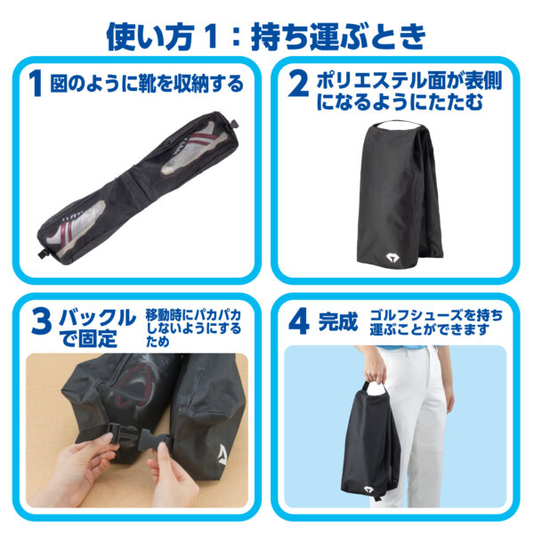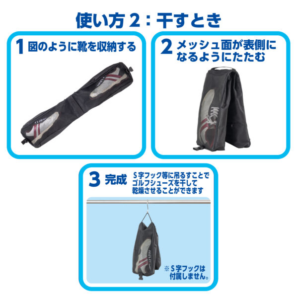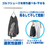 内側に通気性の高いメッシュ生地を採用。収納したまま吊るすことで、シューズ内部の湿気を逃がしやすく、臭いや蒸れを軽減します。ラウンド後のケアが簡単に行え、シューズを清潔な状態に保てます。