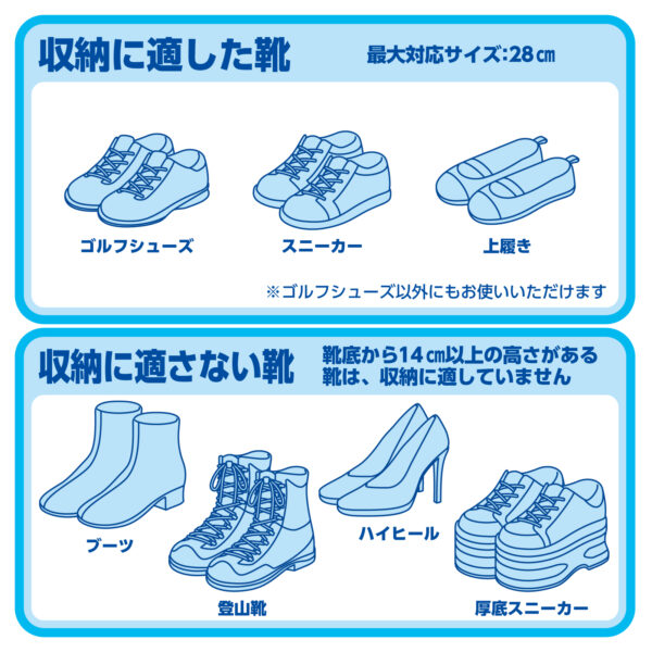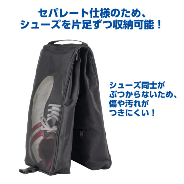 シューズを片方ずつ分けて収納できる独立構造。互いに干渉せず、型崩れや擦れを防ぎます。バックルでしっかり固定できるため、移動中もズレにくく安心です。