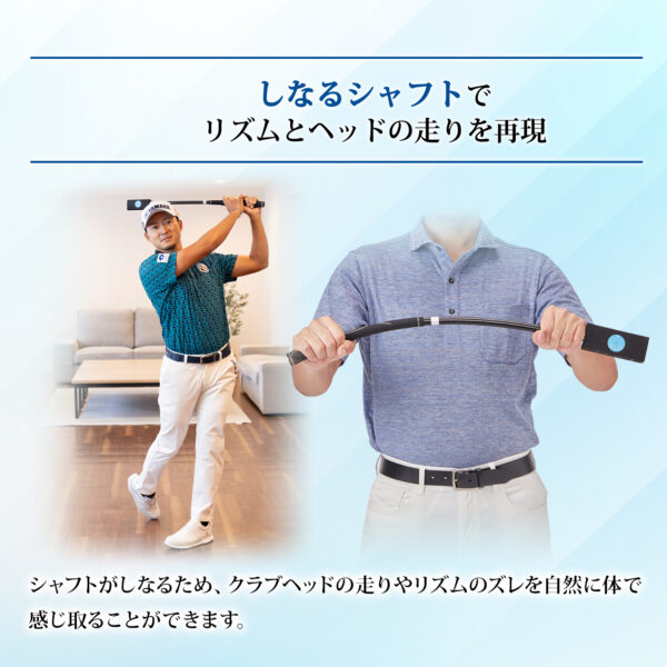 しなるシャフト構造により、手打ちやスイングリズムの乱れを体感的に把握できます。無理に振ると違和感として伝わるため、自然と身体全体を使ったスイングへ修正されます。全長約70cmの静音設計で、自宅や室内でも周囲を気にせず練習でき、中級者が感じ始める課題解決に適したモデルです。