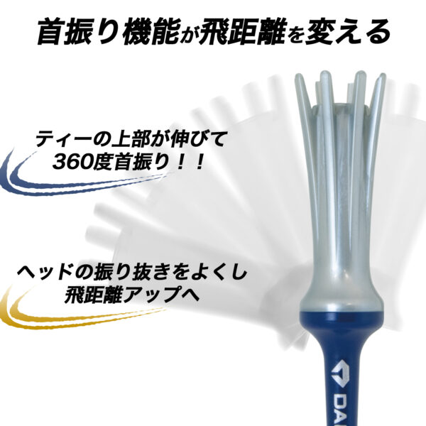 ティーの上部が伸びて、360度ストレスフリーでどの方向に対しても首振りする構造になっています。その結果、インパクト時の抵抗がわずかとなり、ヘッドの振り抜きをよくすることで飛距離アップに繋がります。