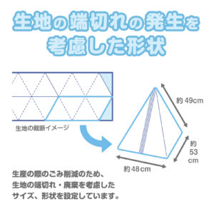 立体的な三角形状の『リサイクルランドリーネット 三角』は、洗濯ネットの中で洗濯物が回転しやすく衣類が偏りにくくなるので、汚れをきれいに落とせます。また、このユニークな三角形状は、生産する際に100%リサイクル生地原反の端切れ・廃棄を減らすことにも貢献しています。