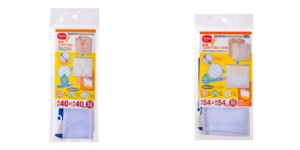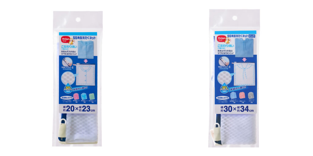 ネットの形状や用途に合わせてパッケージカラーを変更しています。こだわり洗い用、大物対応、絡まり防止、下着専用といった違いが視覚的に判断できるため、購入時の迷いを軽減します。
