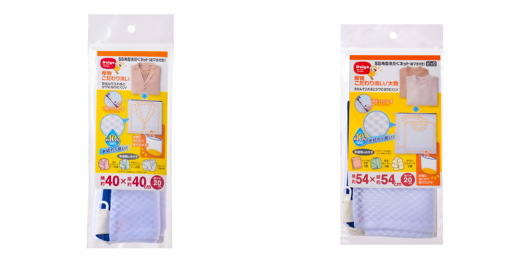 ネットの形状や用途に合わせてパッケージカラーを変更しています。こだわり洗い用、大物対応、絡まり防止、下着専用といった違いが視覚的に判断できるため、購入時の迷いを軽減します。