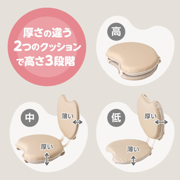 厚み2cmと4cmの2つのクッションを付け替えることで、椅子の形状や子供の成長に合わせて座面の高さを3段階に調節が可能です。