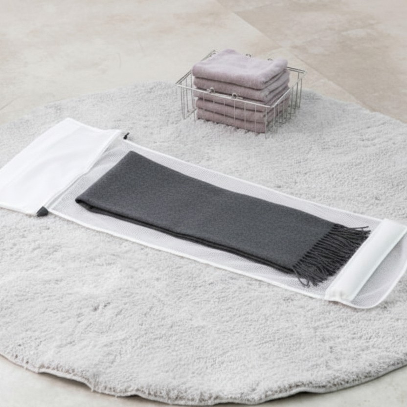 マフラーを洗濯機で洗う際は、洗濯ネットの使用が不可欠です。まずマフラーを適度に畳み、繊維を押しつぶさないようにネットへ入れます。ネットはマフラーの大きさに合ったものを選ぶことで、余分なスペースによる型崩れや絡まりを防げます。ネットに入れることで、洗濯機の回転による摩擦や引っ張りから素材を守り、縮みやほつれ・型崩れのリスクを軽減できます。特にウールやカシミヤは繊細なので、必ず洗濯ネットを使いましょう。洗濯表示で洗濯機OKとなっていても、ネット利用でさらに安心して洗うことができます。