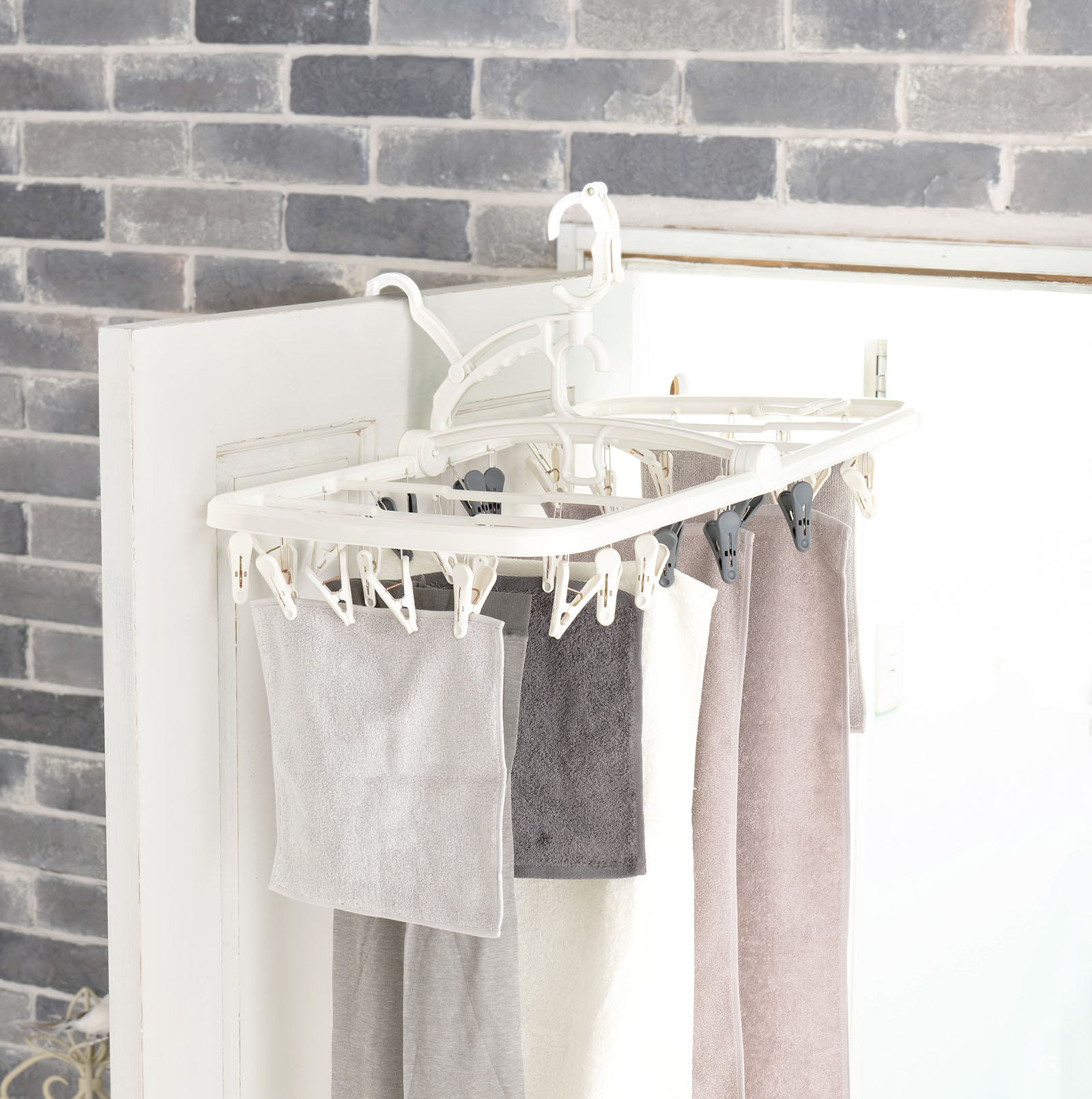 つまみやすい形状の3種類36個のピンチにより、デニムなど重い衣類からランジェリーなどデリケートな洗濯物まで便利に干し分けでき、ピンチ(別売)の付替えも可能な物干しハンガーです。ドアの上に掛けられる室内干し用フック、高い竿に干せるストッパー付きフック、ベランダなど低い竿に干せるフックの3種類のフックを装備しています。ナチュラルホワイトのおしゃれで丈夫な本品は、暮らしにやさしい洗濯をコンセプトにした『フランドリー』シリーズの商品です。