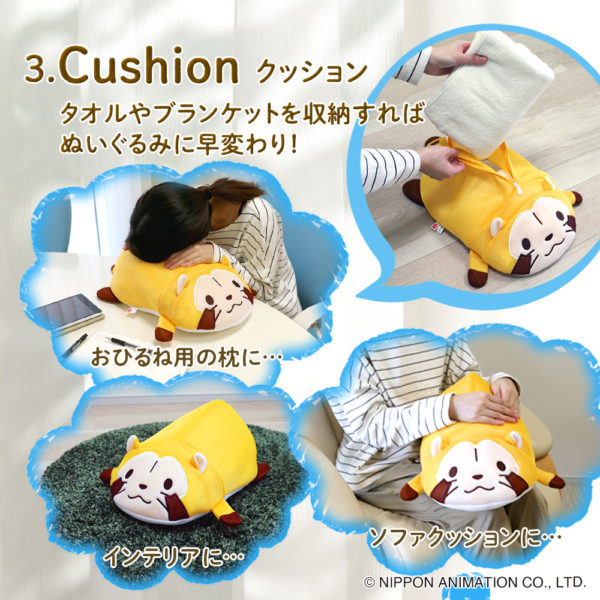タオルやブランケットを収納すれば可愛いラスカルのぬいぐるみに早変わり!お昼寝枕や、お部屋に置いてインテリアとして楽しめます。刺繍で仕上げた顔、手やしっぽは生地を切り替えたこだわりのデザインでラスカルの立体感を表現。リアルなラスカルに癒されます。