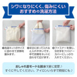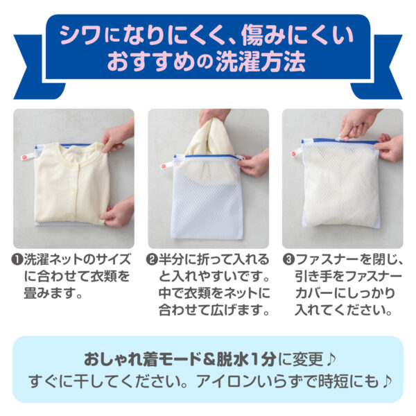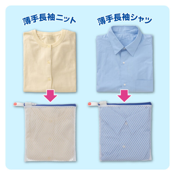 1枚洗いで丁寧に扱いたい衣類を想定し、畳んだ薄手長袖ニットやシャツ、薄手半袖Tシャツにジャストサイズにしました。用途に合わせて選ぶことで、衣類への負担を抑えやすくなり、洗濯の失敗を減らすことにつながります。