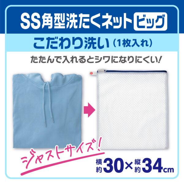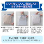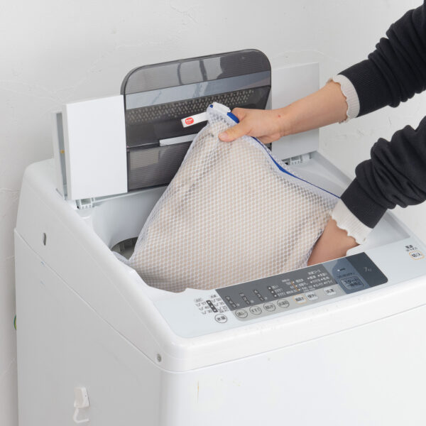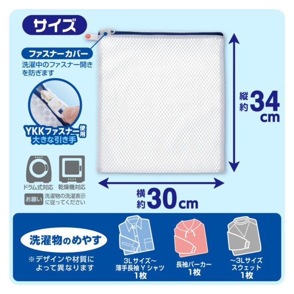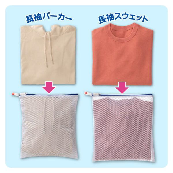 1枚洗いで丁寧に扱いたい衣類を想定し、畳んだ薄手長袖Yシャツ、長袖パーカーにジャストサイズにしました。用途に合わせて選ぶことで、衣類への負担を抑えやすくなり、洗濯の失敗を減らすことにつながります。