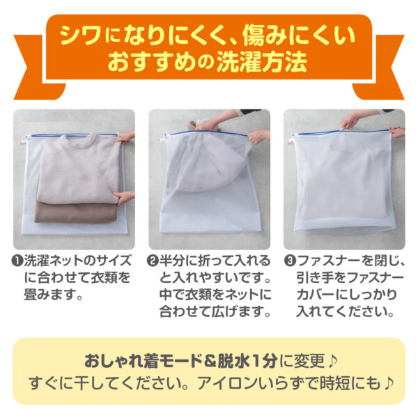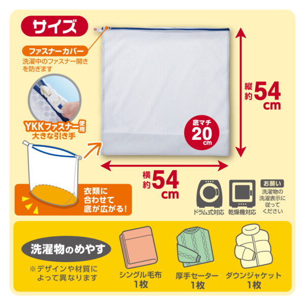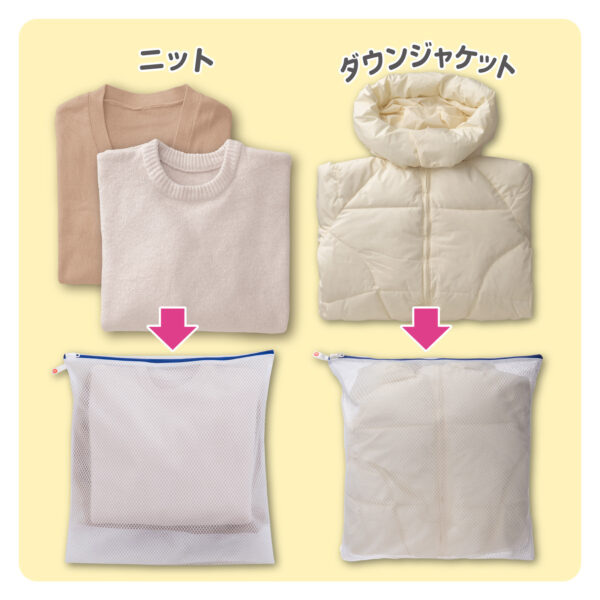 1枚洗いで丁寧に扱いたい衣類を想定し、畳んだシングル毛布、厚手セーター、ダウンジャケットにジャストサイズにしました。用途に合わせて選ぶことで、衣類への負担を抑えやすくなり、洗濯の失敗を減らすことにつながります。