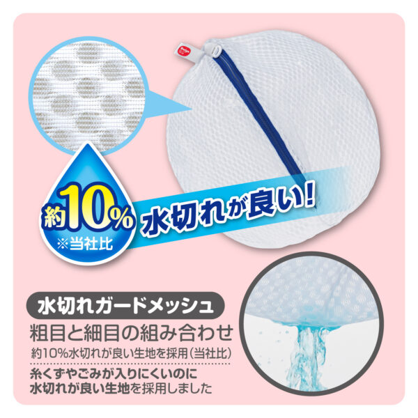 SSネットシリーズは丸いドット状の網目が特徴の水切れガードメッシュ生地を採用しています。糸くずやゴミが入りにくい構造でありながら、水の通り道を確保することで、従来品に比べ約10%※ の水切れ向上を実現しています。生乾きリスクや干し時間に対するストレス軽減が期待できます。