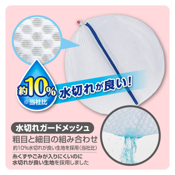 SSネットシリーズは丸いドット状の網目が特徴の水切れガードメッシュ生地を採用しています。糸くずやゴミが入りにくい構造でありながら、水の通り道を確保することで、従来品に比べ約10%※ の水切れ向上を実現しています。生乾きリスクや干し時間に対するストレス軽減が期待できます。
