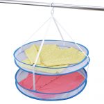 傾いても洗濯物が落ちにくいラウンドガードが付いた大型(直径約69cm)2段式の平干しネット。秋冬シーズンに活躍するニット類やおしゃれ着の平干しに便利です。