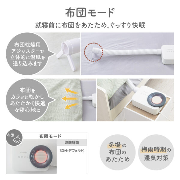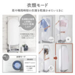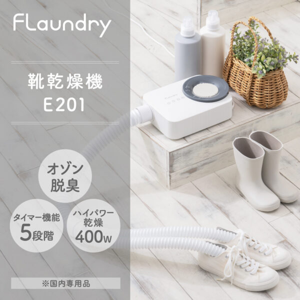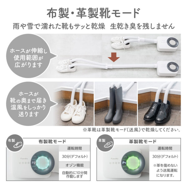 北欧風デザインの洗濯用品シリーズ「Flaundry」の靴乾燥機です。靴の内部から細径約4cmのホースで風を届けて乾きにくい部分も効率乾燥し、オゾン脱臭機能により気になるニオイも抑えます。安定感のある横置き型の本体は、バタバタした朝でも玄関に置いていても倒れる心配がいらず、シンプルでコンパクトなデザインは、操作しやすく、玄関やシューズクローゼットに収納しやすいデザイン設計です。形状保持型の伸縮ホースにより靴の形状に合わせられるので、さまざまな靴に対応します。さらに布靴、革靴、布団、衣類の4つのモードから選ぶことができ、モードごとにランプの色が変化するので、一目でわかりやすくなっています。