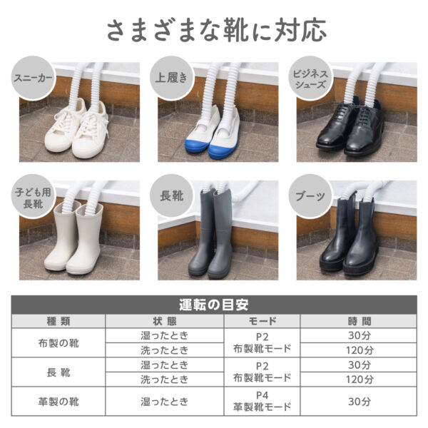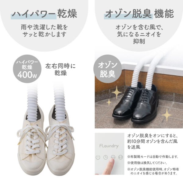 靴乾燥には十分な400Wで、狭い靴の内部でも入りやすい細め約4cmホースが温風を送ります。狙った場所に風を当てられるので、靴にありがちな乾きムラを抑えます。すべてのモードで使用できるオゾン機能付きです。形状保持型の伸縮ホースが靴の形状に合わせられるので、さまざまな靴に対応します。